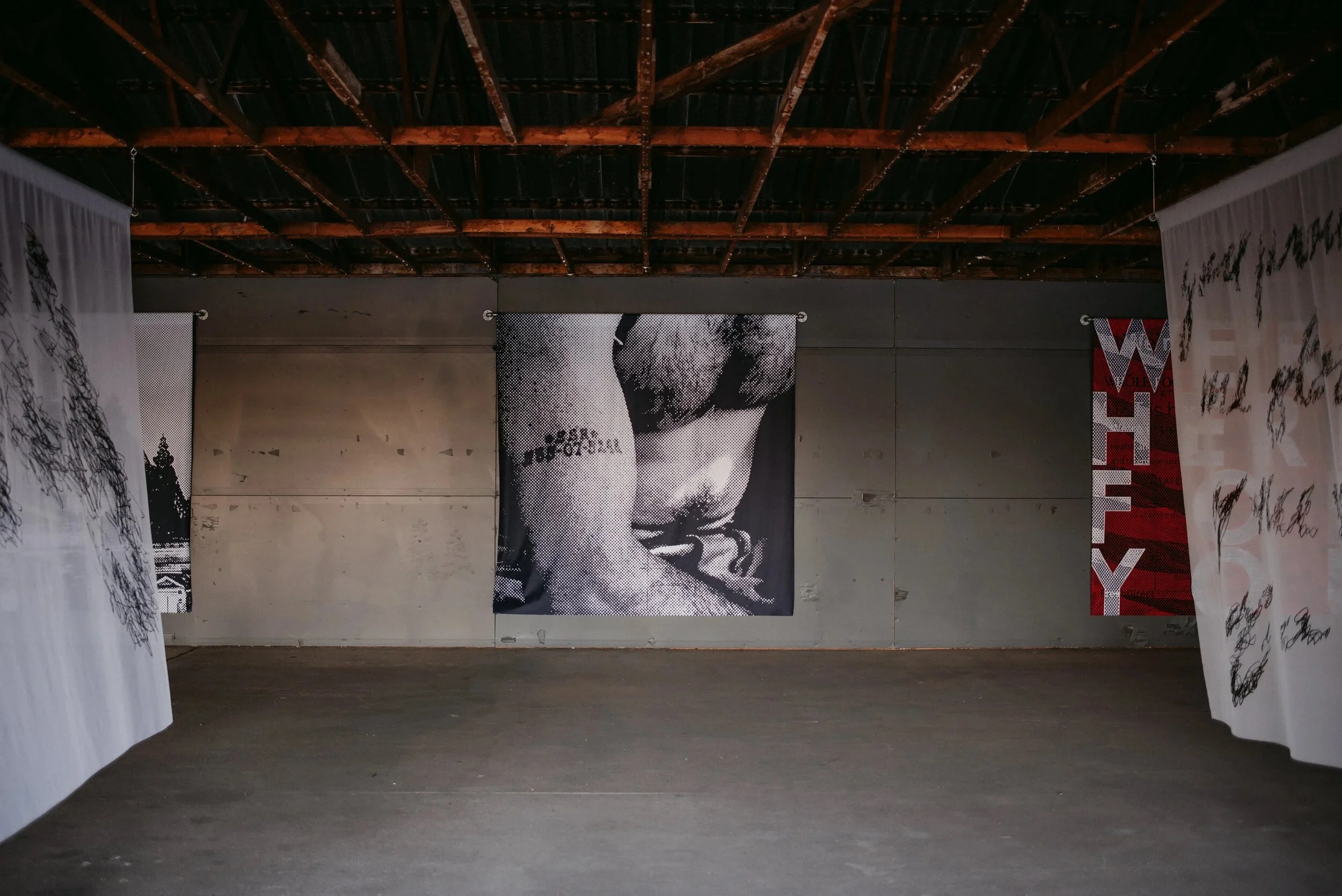 1933/1984/2020 is a site-specific commission by Tinworks Art in Bozeman, Montana. This series of eight 8’x8’ hanging works constitutes a volley of images—half computer-generated, half hand-drawn—designed to link the web of suffering triggered by inadequate pandemic preparedness and the resulting commercial advertising responses reifying the false promise of abundance that is late-capitalism. The installation is centrally articulated through two radically different responses to the economic strife of 1933: Germany’s burning of the Reichstag, and America’s New Deal, represented as a Social Security Number tattooed on an itinerant worker’s arm when the idea of a social safety net was new. The graphite drawing paired with this second image is a text from an Irish poem renamed “Broken Vows” in John Houston’s posthumously released 1987 film, The Dead. My boyfriend asked me to see it with him. He was dead within a month. It was my first pandemic, and this installation is my attempt to come to grips with my second, stated here as a skirmish between fact and frailty, corporeality and memory, commerce and survival, promise and cruelty.